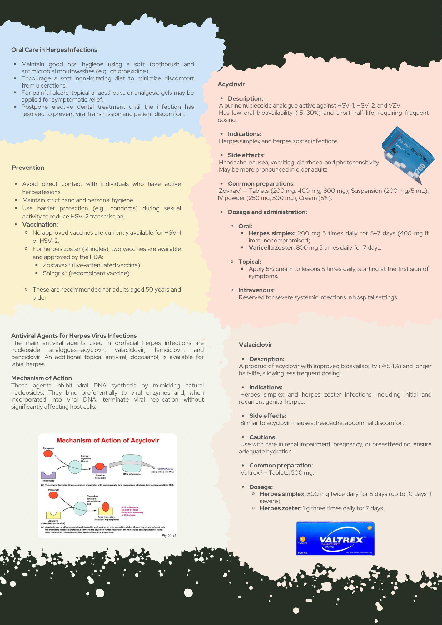• Antiviral Medications: Learn indications and dosing for oral viral infections such as herpes simplex and varicella-zoster, with focus on patient safety.